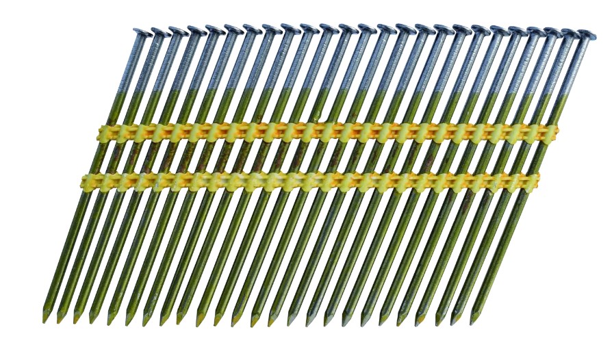 Gwoździe skrętne 3.8×130 mm na taśmie plastikowej to wydajne rozwiązanie do szybkiego montażu elementów drewnianych przy użyciu gwoździarek bębnowych lub magazynkowych. Spiralny (skrętny) trzon gwarantuje wysoką siłę mocowania i odporność na wyrwanie, co czyni je idealnymi do zastosowań konstrukcyjnych. Długość 130 mm umożliwia łączenie grubych elementów drewnianych, takich jak belki, słupy czy legary. Taśma z tworzywa sztucznego pozwala na płynne i szybkie podawanie gwoździ, skracając czas pracy.